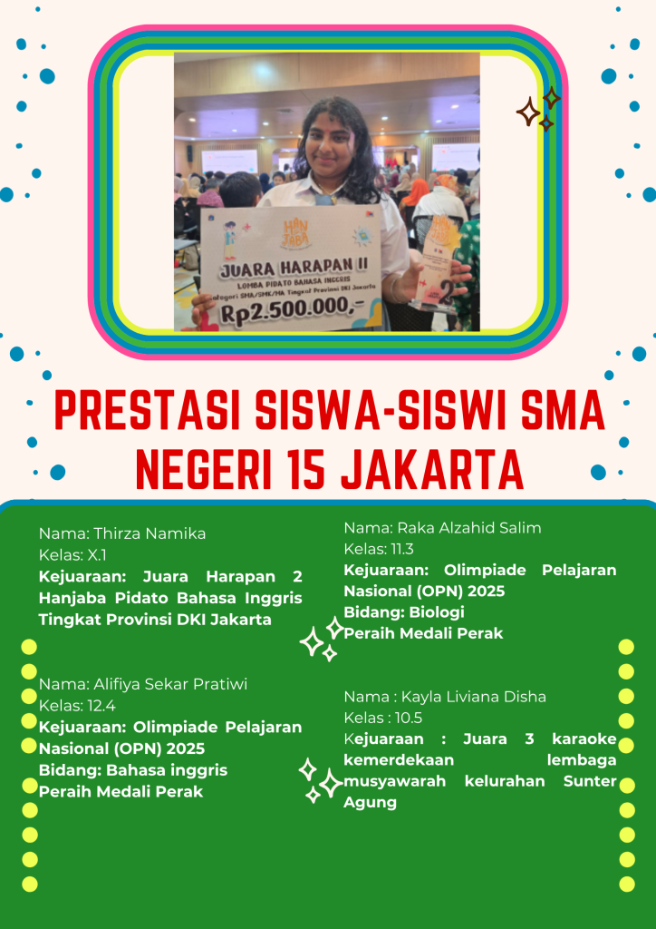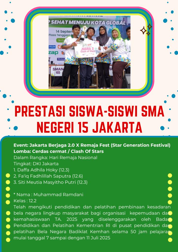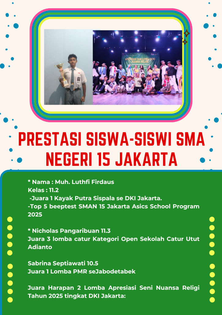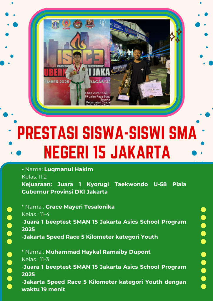Jakarta, Oktober 2025 — Dalam dua bulan terakhir, yakni Juli hingga September 2025, SMAN Negeri 15 Jakarta kembali menunjukkan eksistensinya sebagai salah satu sekolah berprestasi di DKI Jakarta. Berbagai penghargaan berhasil diraih oleh para siswa, baik bidang akademik maupun non-akademik.