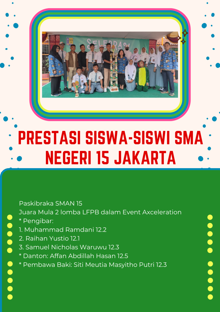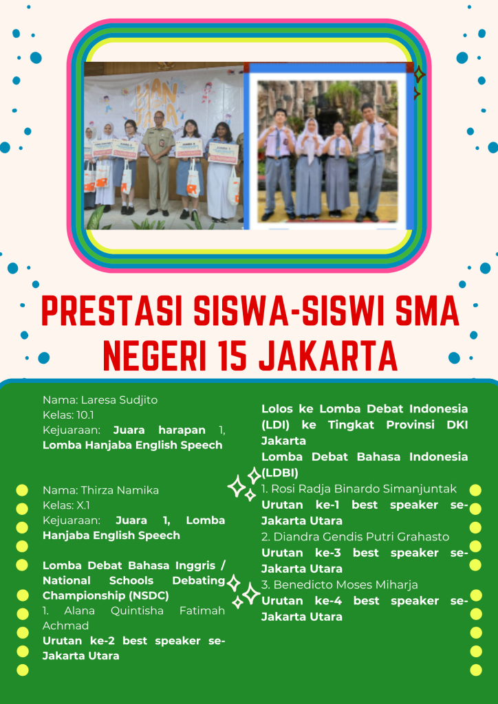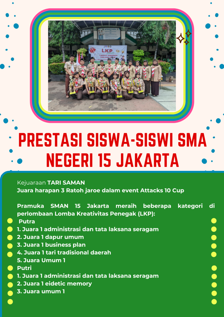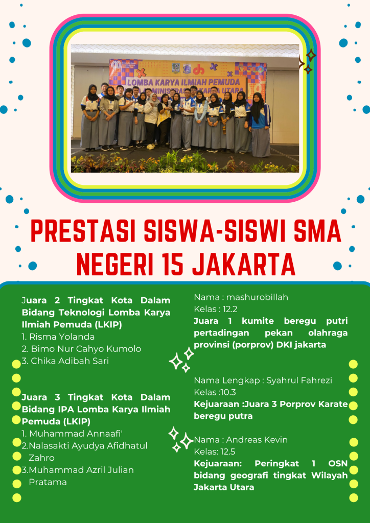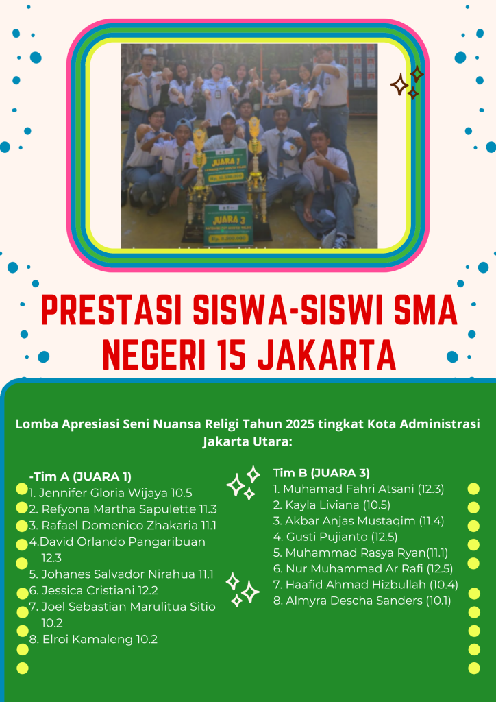 Jakarta, Oktober 2025 — Dalam dua bulan terakhir, yakni Juli hingga September 2025, SMAN Negeri 15 Jakarta kembali menunjukkan eksistensinya sebagai salah satu sekolah berprestasi di DKI Jakarta. Berbagai penghargaan berhasil diraih oleh para siswa, baik bidang akademik maupun non-akademik.